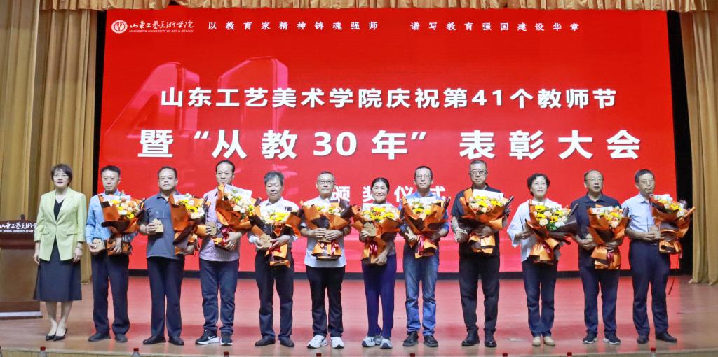 大會播放“從教30年”教職工宣傳視頻;王曉娟、董占軍為受表彰教職工代表頒發(fā)紀念獎杯;新進青年教師向受表彰教職工獻花。