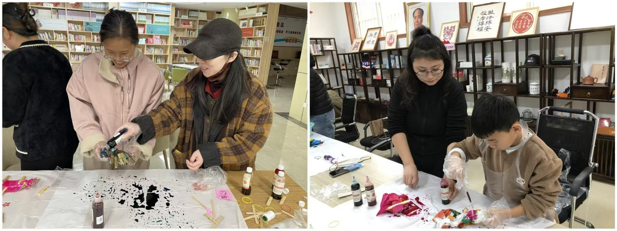 淄博社區活動中心的扎染課堂,則飄起了斑斕的色彩。現代手工藝術學院周晨老師從“藍草染布”的古老傳說講起,手指翻飛間,演示了“捆扎法”等傳統技藝。當素白布料浸入染料,再被小心翼翼取出時,藍白相間的紋路驚艷了全場——有的像山間云霧,有的像水波漣漪,有的像繁花綻放。居民們互相展示著自己的作品,兩位社區居民舉著染好的桌布笑開了花:“以前總覺得非遺離我們遠,沒想到能親手做扎染,真好看!”技藝傳承之外,更有鄰里間的歡聲笑語在空氣中流淌。