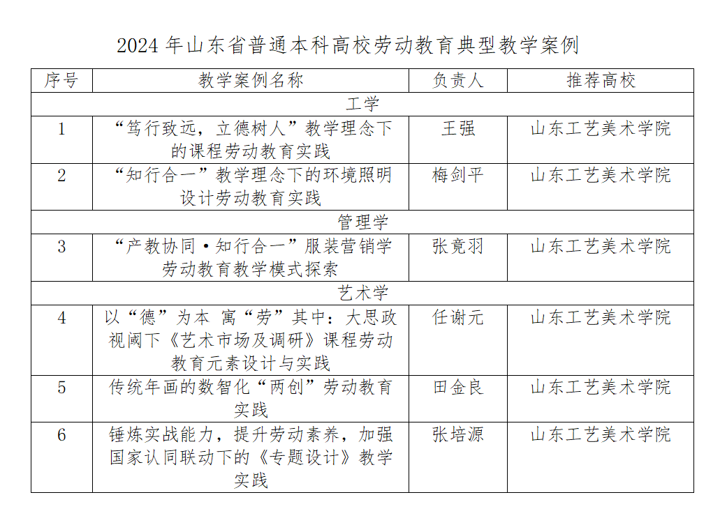 近日,山東省普通高等學校教育教學指導委員會發布《關于公布 2024 年山東省普通本科高校勞動教育典型課程教學設計、教學案例和實踐項目遴選結果的通知》,我校推薦的15個項目中10個項目入選。其中典型教學案例6項、專業實踐項目3項、第二課堂實踐項目1項。