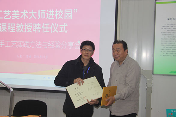 10月20日,2016海峽兩岸工藝美術發展學術研討會暨工藝美術設計教育圓桌會系列活動之“工藝美術大師進校園”課程教授聘任儀式暨傳統手工藝實踐方法與經驗分享會在歡迎來到公海7108線路長清校區舉行。現代手工藝術學院聘任臺灣金工與鋦瓷藝術家陳高登、琉璃藝術家黃安福為“工藝美術大師進校園”課程教授。現代手工藝術學院院長趙進為陳高登頒發聘書,副院長宋處嶺主持儀式。