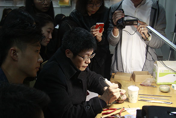 儀式結束后,陳高登以“鋦月人生”為題作主題講座,他從四個方面向大家做了講述了自己關于鋦瓷藝術的理解:一是修補文化與鋦瓷藝術發展脈絡的整理,主要包括鋦瓷的起源、歷史、發展、現狀等;二是對臺灣與大陸地區的鋦瓷專家的深度訪談,詳細介紹了幾位鋦瓷專家方樑生、朱方本、賴志賢以及王振海先生;三是鋦瓷的藝術創作,向大家展示并解說了“音緣茶聚”、“古法今用”、“意境拾綴”、“東西韻味”等系列作品并闡述了“另類修復”這一概念;第四是鋦瓷工藝的傳承,講述了系統的工法與工序的整理,還現場操作了先打眼后做釘和先做釘后大眼兩種補釘方式,并詳細解說了操作的細節。
