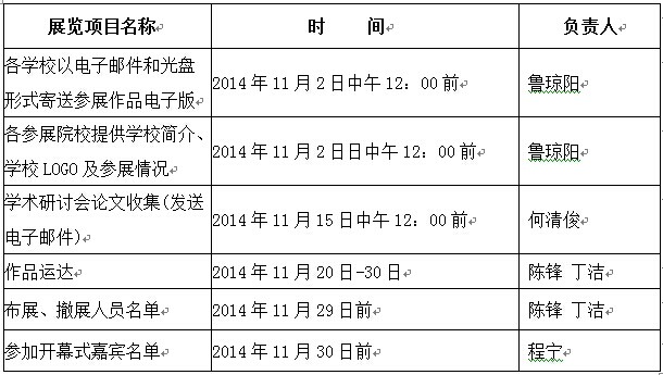 為保證《作品集》的編纂工作順利進行,參展作品圖片以電子郵件和光盤兩種形式同時提交,截止2014年11月2日中午12:00。 電子郵箱:424153039@qq.com 作品光盤寄送地址:湖北省武漢市江夏區藏龍島科技園楊橋湖大道陽光100大湖第,郵編:430205 收件人:魯瓊陽 電話:15027478165 注:各參展院校的學院簡介、學校LOGO等相關材料隨電子郵件和光盤一起寄送。