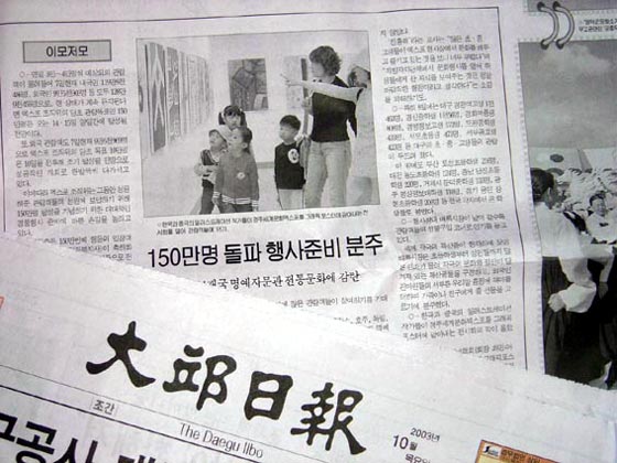 10月12日,由于韓國藝術活動開幕式一般在下午五時舉行的慣例,訪問團上午參觀了國立大邱博物館。此館于1994年12月開館,收藏品約達2萬余件,館內設有考古室、美術室、民俗室等常設展覽室和一個特展室、體驗學習室,用以綜合展現出大邱、慶北西部、北部地區的史前、史后時期的文化。其中的特展室通過做拓本、仿做土器、盡情畫畫、磨磨石等活動,親身體驗許多古人的文化生活,以感性方式對青少年進行文化傳承教育。