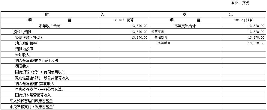 2016年財政撥款支出預算為13570萬元,均為教育支出普通教育支出,主要用于工資福利支出、對個人和家庭的補助支出、商品和服務支出和項目支出。