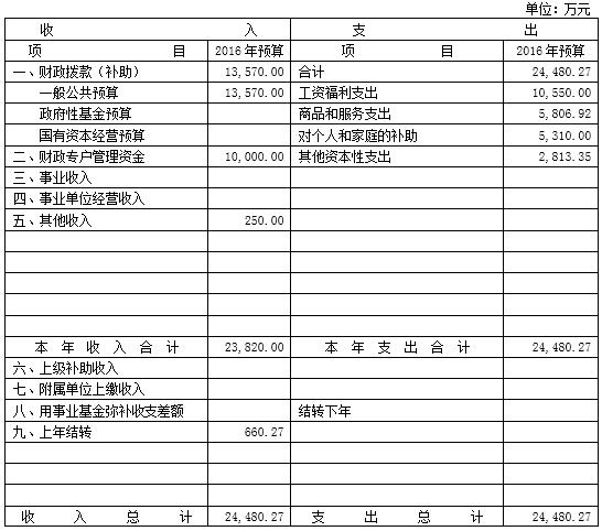 2016年收入預算為23820萬元,其中財政撥款13570萬元,財政專戶管理資金10000萬元,其他收入250萬元。上年結轉660.27萬元。