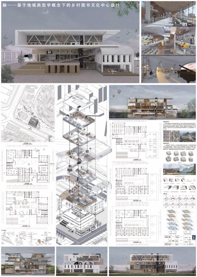 劉靜儒同學的鄉村圖書文化中心設計,在版式上分成上中下三部分,每一部分比例協調合理,整體色調上選擇淡雅的灰藍色調,視覺感受比較舒適。