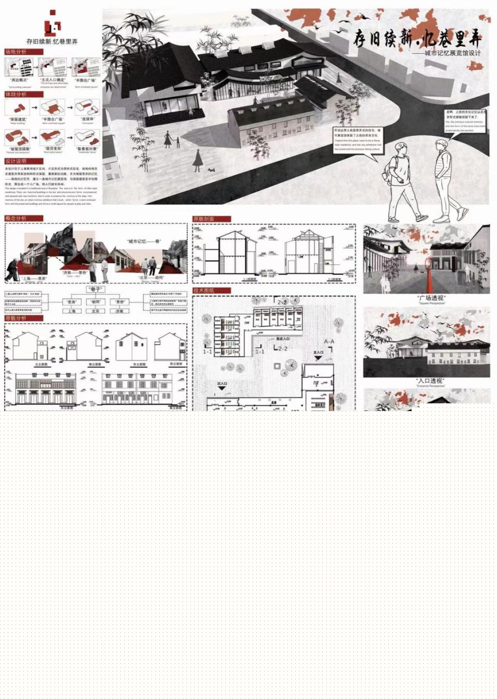 寧同學的《城市記憶展覽館》,整體灰色調的基礎中加入相對濃重的紅色,使整體效果穩重中又不失活潑,表達上中國元素的運用,也更突出城市記憶的設計主題,達到了表現和設計相輔相成的效果。