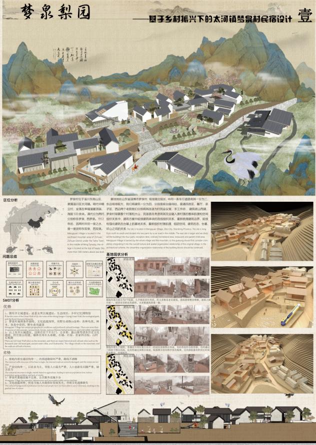 馮紹濱、姜智涵、唐梓軒的《太河鎮夢泉村民宿設計》,采用中國國畫風格的表現方式,用色、構圖以及配景既有傳統國畫的風韻,又不失現代的表達,使得作品能在眾多作品中一眼被看到,各種表現圖主次分明,相得益彰。