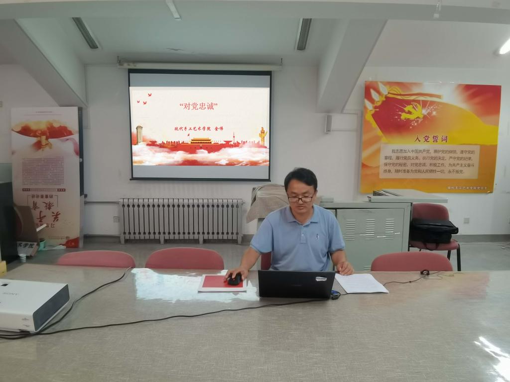 2021年6月25日,現代手工藝術學院黨總支書記金偉在B444多媒體教室為學院黨員教師講授《對黨忠誠》黨史學習教育專題黨課。