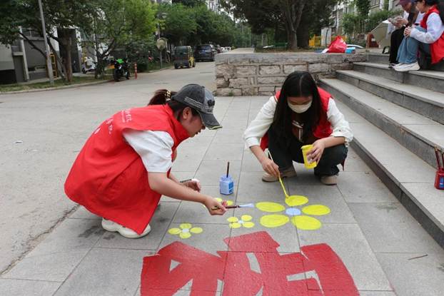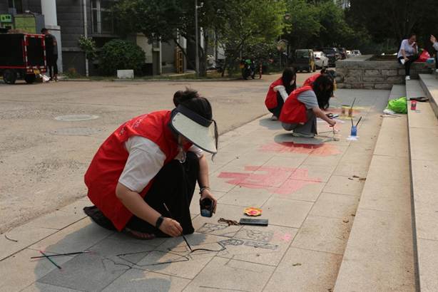 活動接近尾聲,經過大家的精心創作,原本單調的地面煥然一新,成為社區一道亮麗的文化風景線。紫薇閣社區負責人高度評價道:"此次活動不僅提升了社區環境品質,更以藝術形式潤物無聲地傳播了文明理念。同學們展現出精湛的藝術素養和團隊協作能力,這種校社聯動的創新模式,既拓展了大學生社會實踐的深度,也增強了社區居民的歸屬感。"
