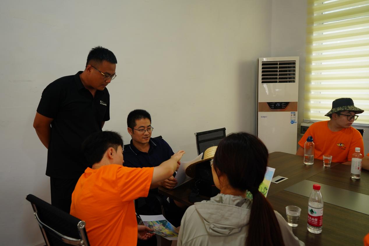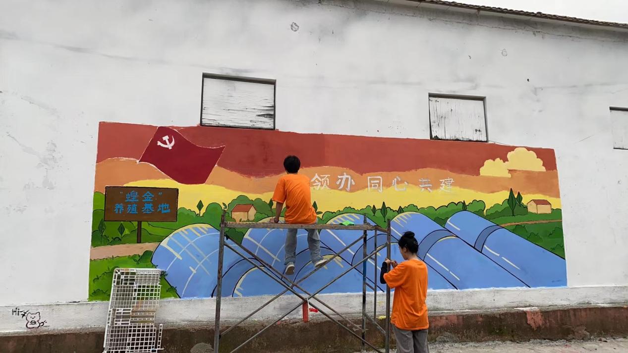 7月13日,實踐團隊成員進行實地考察,辛集鎮人大主席侯合雷、鳳頭村省派第一書記王其仁、黨支部書記秦其斌與團隊成員座談交流,他們對社會實踐隊伍表示熱烈歡迎,希望團隊發揮專業優勢,結合當地特色產業設計創意墻繪,助力打造鄉土特色品牌。團隊師生將螞蚱產業、新農人等元素巧妙融入作品設計,反映出實踐團隊成員對當地鄉村產業振興的美好祝愿。