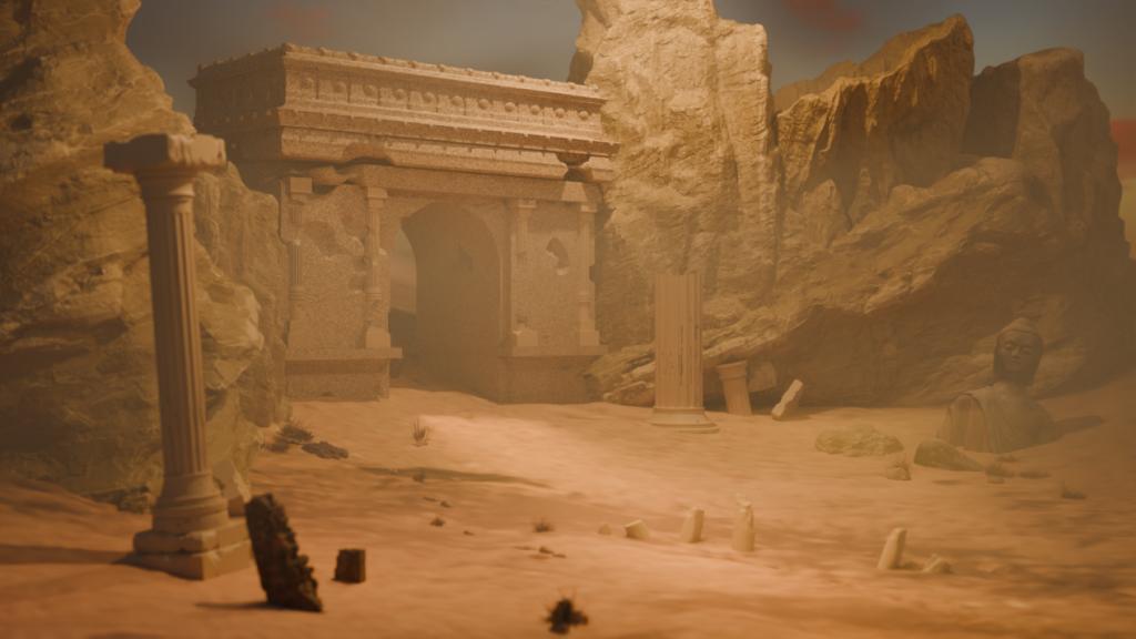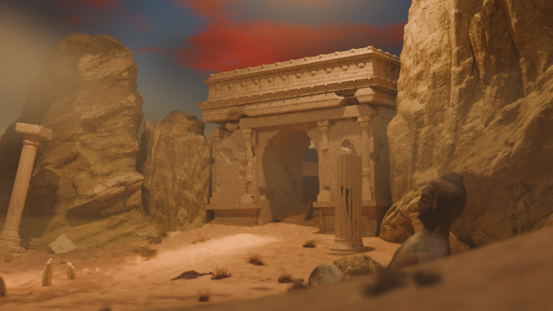 畫面內(nèi)建筑的靈感來源來自于奧利爾斯坦因所著的《西域考古記》和《在中亞的古道上》等書籍資料,從中我們了解到樓蘭是一個(gè)融合了東西方文化元素的國家。因此,我們選取了古印度時(shí)期的佛塔形制、類似漢長城的城墻、古羅馬時(shí)期的城門和柱式,以及漢代出土的佛像等元素融入畫面設(shè)計(jì)中。