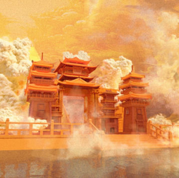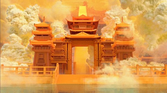 《恒》是一個(gè)基于中國古代神話仙界以及漢代升仙思想的三維場景建模作品。我們參考了巫鴻老師的著作《黃泉下的美術(shù)》中對升仙的描繪對場景進(jìn)行了想象,仿照漢代未央宮規(guī)模宏大的特點(diǎn),追求靈動(dòng)、躍騰、升華的空間效果,視覺上加入大量云朵、霧氣的元素,讓人仿佛身處金碧輝煌的仙境。氣氛圖使用生成式AI工具Midjourney通過提供關(guān)鍵提示詞與概念設(shè)計(jì)圖組合以圖生圖與文生圖并行的形式進(jìn)行場景氣氛圖繪制,加入了粒子特效以及體積云模組以烘托神秘、夢幻的視覺特點(diǎn)。漢代天界升仙場景模型展現(xiàn)了古人對天界的想象,引導(dǎo)觀眾思考人與自然、宇宙的關(guān)系,以及漢代哲學(xué)思想中的“天人合一”和對生命意義的探索。