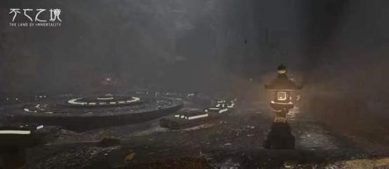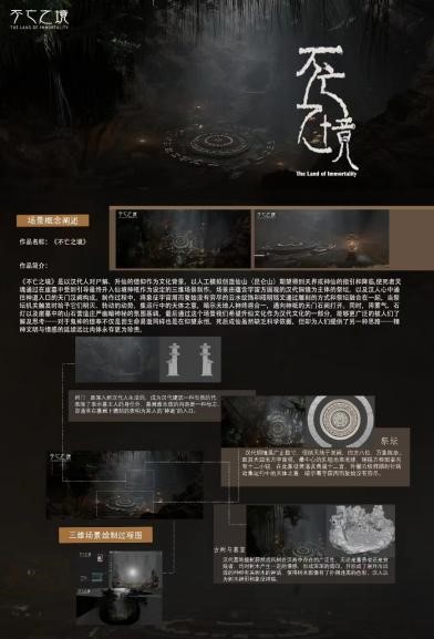 《不亡之境》是以漢代人對尸解、升仙的信仰作為文化背景,以昆侖山(百神所在之地)為環(huán)境設(shè)定的三維場景制作。場景由蘊(yùn)含宇宙方圓觀的漢代銅鏡為主體的祭壇,漢人心中通往神道入口的天門漢闕以及生于西方昆侖的長青樹構(gòu)成,其中祭壇主要參考西漢晚期昭明銅鏡,長青樹又稱長生樹其靈感源自于資料《漢畫像石中樹的象征意義》——作者陶華。制作過程中,將象征宇宙周而復(fù)始沒有窮盡的云水紋飾和昭明銘文通過雕刻的方式和祭壇融為一體,當(dāng)祭壇機(jī)關(guān)觸發(fā)時(shí)產(chǎn)生明滅、轉(zhuǎn)動(dòng)的動(dòng)勢,集運(yùn)行中的天體之意,暗示天地人神終將合一,通向神祇的天門石闕打開。最后希望通過這個(gè)場景能向大家展示出漢代民眾對升仙強(qiáng)烈的向往和追求以及他們對死亡和永恒生命的深刻思考及實(shí)踐。