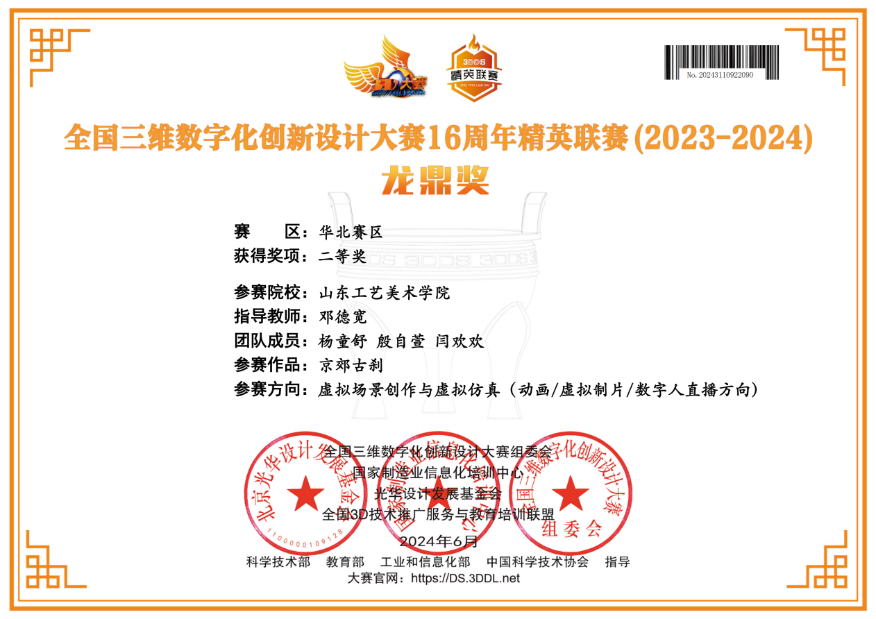 2024年7月,在“全國3D大賽16周年精英聯(lián)賽(2023-2024)”虛擬場景創(chuàng)作與虛擬仿真專項(xiàng)賽中,數(shù)字藝術(shù)與傳媒學(xué)院21級戲劇影視美術(shù)設(shè)計(jì)專業(yè)的四組學(xué)生作品在大賽中脫穎而出,榮獲華北賽區(qū)二等獎(jiǎng)三位,三等獎(jiǎng)一位,鄧德寬老師榮獲優(yōu)秀指導(dǎo)教師。