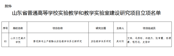 近日,山東省教育廳發(fā)布了《關(guān)于公布2024年實驗教學(xué)和教學(xué)實驗室建設(shè)研究項目立項名單的通知》(魯教高函〔2024〕21號),數(shù)字藝術(shù)與傳媒學(xué)院吳向陽教授主持的《影視跨專業(yè)產(chǎn)教融合實驗教學(xué)體系創(chuàng)新研究》獲立項。