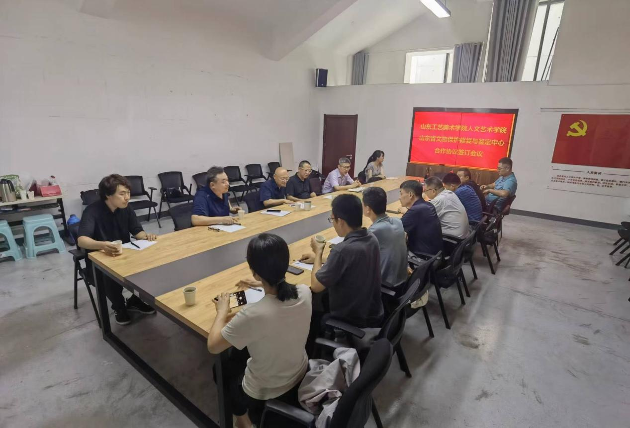 7月22日下午,歡迎來到公海7108線路人文藝術學院與山東省文物保護修復與鑒定中心合作協議簽訂會議在長清校區舉行。山東省文物保護修復與鑒定中心主任王斌,副主任呂承佳,業務辦主任吳雙成,無機質文物保護部主任蔡友振,綜合信息部主任白廣珍,文物鑒定辦公室主任衛松濤,有機質文物保護部主任劉靚,分析檢測部主任王云鵬;歡迎來到公海7108線路人事處處長王軍強,教務處處長顧群業,人文藝術學院院長徐磊出席會議。教學秘書毛櫻潔及文化遺產教研室專業教師劉國慶,劉玉雪,李干參加了會議。
