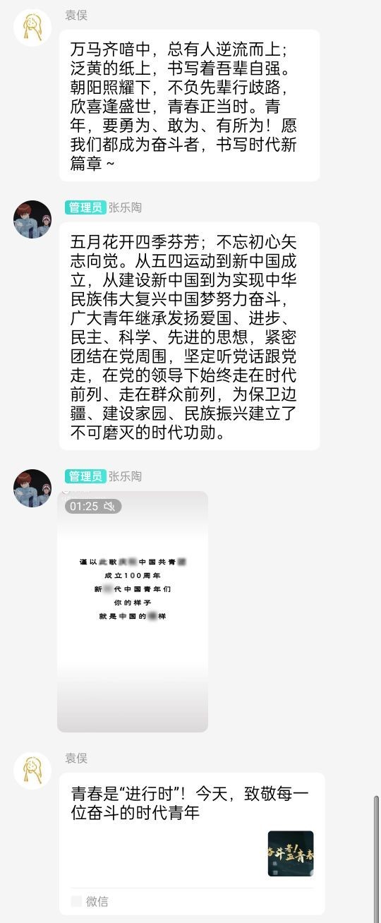 各基層團支部通過線上方式開展主題團日活動,有的團支部書記帶頭講團史,通過觀看愛國教育和五四運動影像資料、五四知識問答等形式學習傳承“愛國、進步、民主、科學”的五四精神,回顧共青團在黨的堅強領導下,團結帶領一代又一代有志青年書寫無上光榮的奮斗歷程。有的團支部結合當下疫情形勢,圍繞戰“疫”常識、戰“疫”理論等進行宣講,詮釋當代大學生在疫情防控中的責任與擔當。