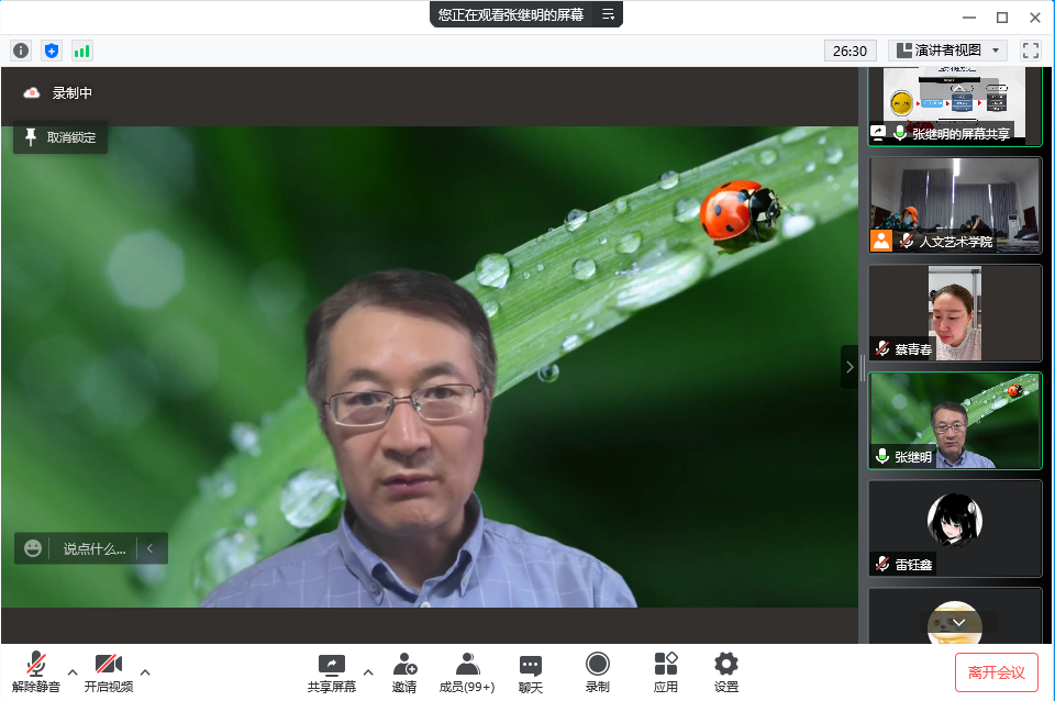 講座結束后,人文藝術學院黨總支副書記蔡青春對講座進行了簡要總結,提出了期許和建議,鼓勵大家以正確積極的情緒面對疫情下的學習和生活,保持愉悅的心情和向上的生活態度,以合理的方式緩解和釋放壓力,以樂觀開朗的心態面對學習生活,從各方面不斷提高自身的綜合素質。