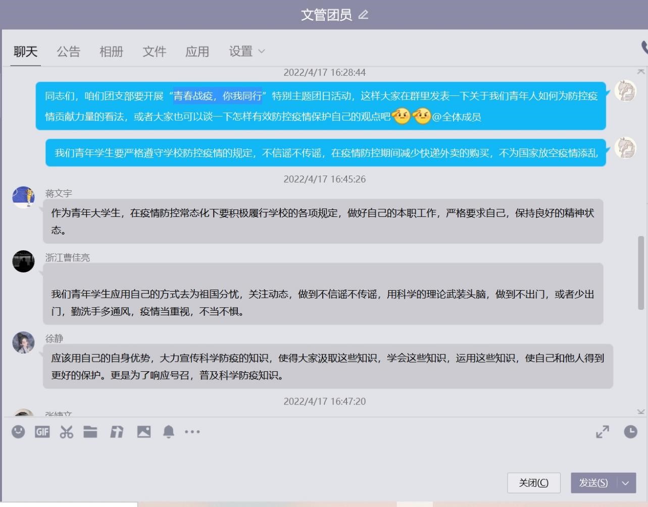 本次活動中,各團支部以線上形式“齊聚一堂”,分享疫情防控、抗擊肺炎過程中的心得與奇妙際遇。通過解讀防疫政策、防疫知識宣傳,宣讀承諾書(倡議書)等多種形式,全面動員廣大學生,加強自我管理、自我服務、自我監督、自我提升意識,充分發揮團員先鋒模范作用,自覺投身校園疫情防控阻擊戰。此外,在線上會議交流過程中,多個團支部成員談及在疫情過程中學習文件的心得體會,身處疫情重災區的成員分享自疫情發展以來自身的生活狀況和對家鄉、對祖國戰勝疫情的信心!