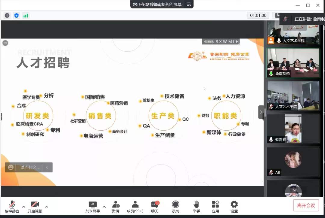 魯南制藥集團招聘經理潘曉帥經理詳細介紹了魯南制藥集團的發展歷程、經營理念、研發平臺等公司情況,讓我們進一步加深了對魯南制藥集團的了解。互聯網大事業群HR主管楊淑超根據這次就業宣講和崗位需求,有針對性的介紹了互聯網大事業群的組織架構,崗位需求信息和個人發展平臺。并歡迎同學們積極參與實習、應聘,期待大家成為魯南制藥的一員。