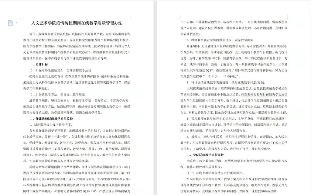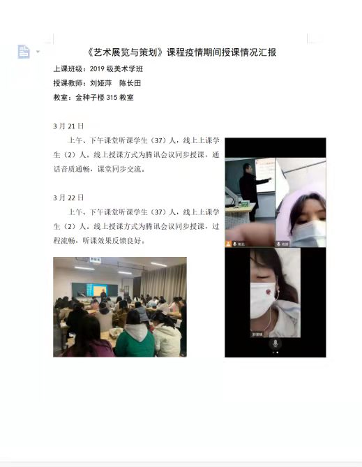 根據學校疫情防控工作相關要求,學院前期制定了“人文藝術學院關于2021-2022學年第二學期集體備課活動方案”“因疫情無法返校學生教學方案”“人文藝術學院疫情防控期間在線教學質量管理辦法”等預案,并根據教務處相關要求組織授課教師進行相關演練,線上教學預案啟動后,廣大教師積極選用雨課堂及騰訊會議等教學平臺或軟件進行線上授課,廣大教師對相關流程較為熟悉,線上教學運行整體平穩順暢。