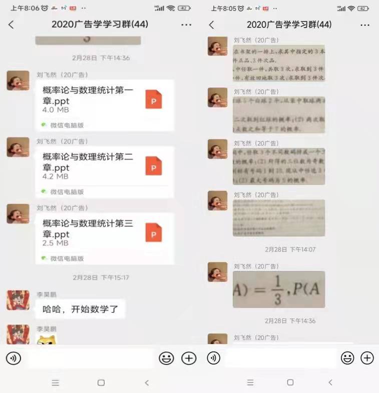 《概率論與數理統計》課程,在前期線下教學的基礎上,授課教師韓寶燕通過班級微信群布置了結課作業和相關知識內容,課程順利結束,教學效果良好。