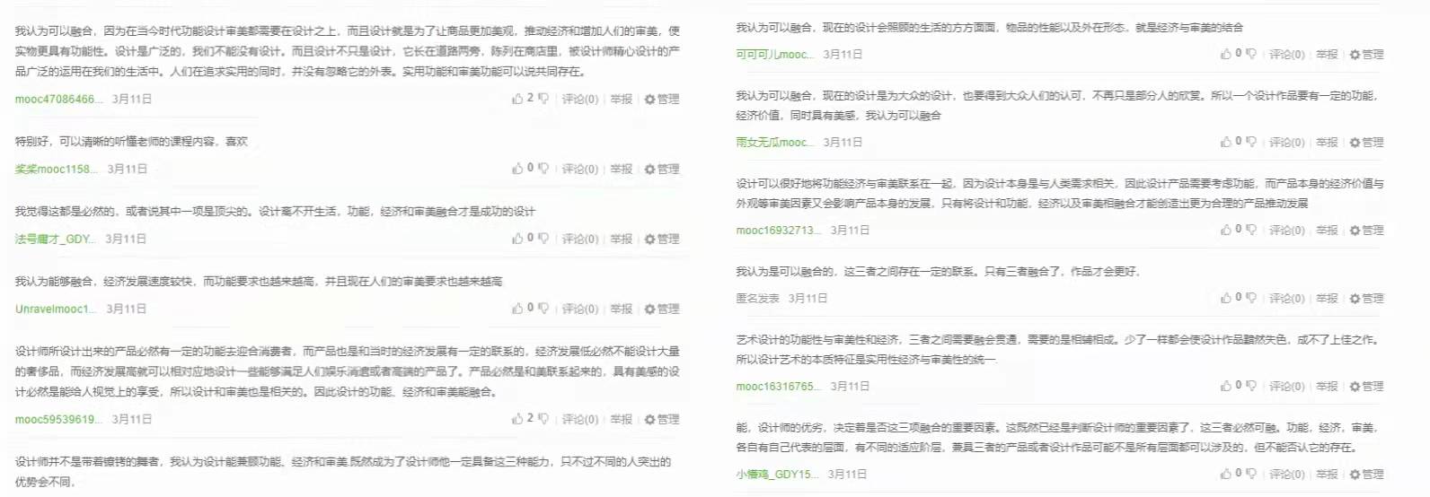 《社會學與生活》為新開課程,任課教師張愛紅依托學校在建spoc課程資源,通過騰訊會議+中國大學慕課異步spoc課堂完成教學,并生成相應教學數據。本周主要教學內容為:一、課程導論,關于課程主要內容、學習目標、課程評價方式、推薦閱讀書目等內容的講解;二、關于設計藝術基本屬性的認知。對設計藝術的概念、設計藝術的基本屬性等進行講解。