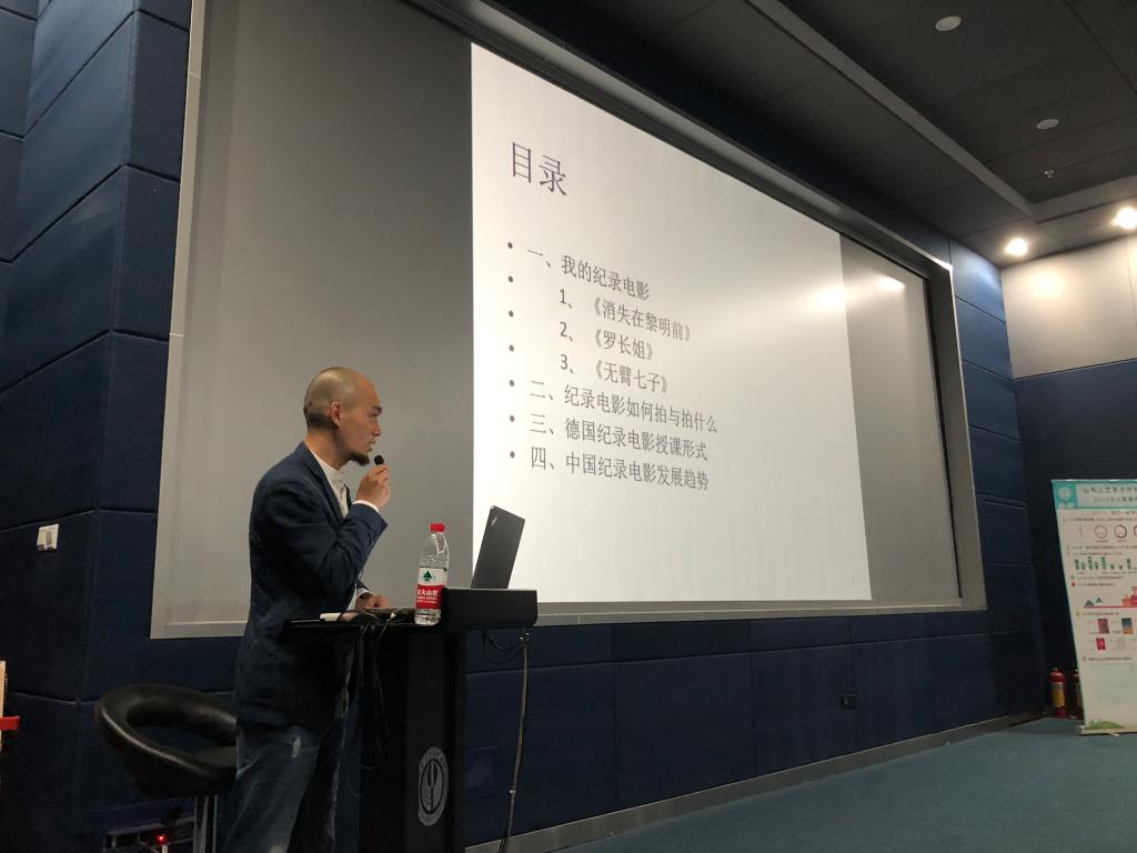 隨后,著名紀錄片制作人金行征先生為現場師生作《紀錄電影創作》主題講座。金老師以自己的紀錄電影為基礎,介紹紀錄片《消失在黎明前》、《羅長姐》、《無臂七子》幕后制作經過,結合自己留學德國經歷,講解紀錄電影如何拍與拍什么和德國紀錄電影授課形式,并結合實際電影運作談中國紀錄電影發展趨勢。金老師的精彩講座增進了學生們對紀錄片電影的認識和了解,也極大的激發了學生們的創作熱情。