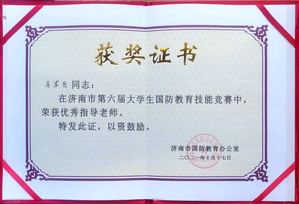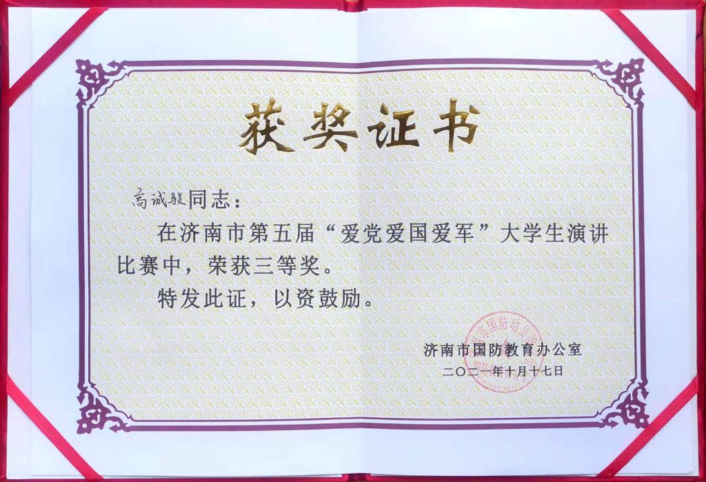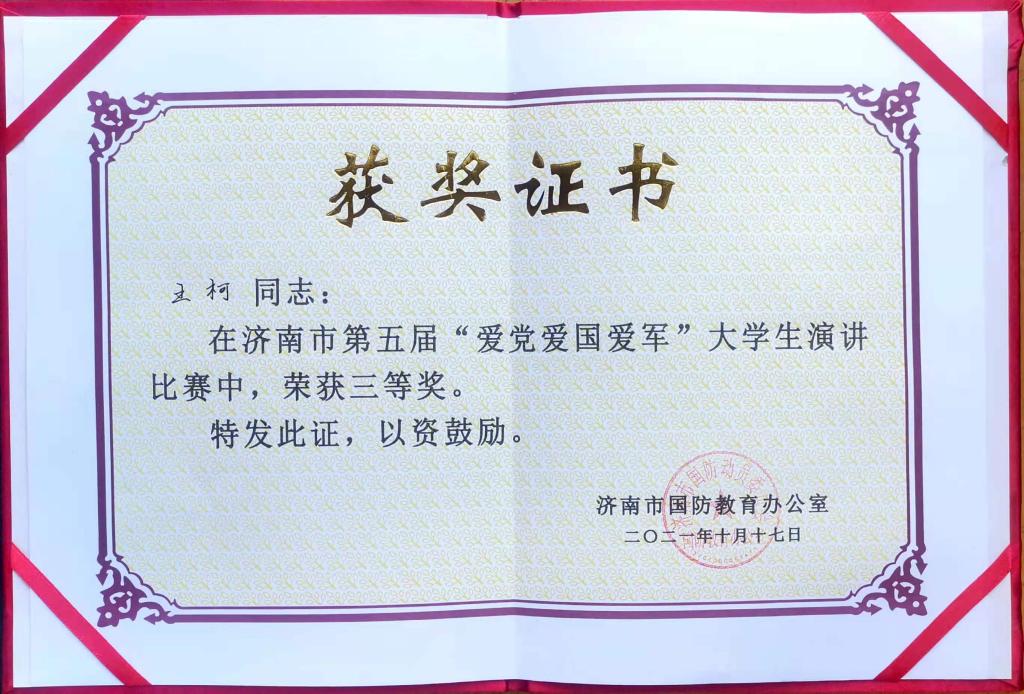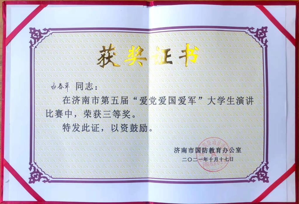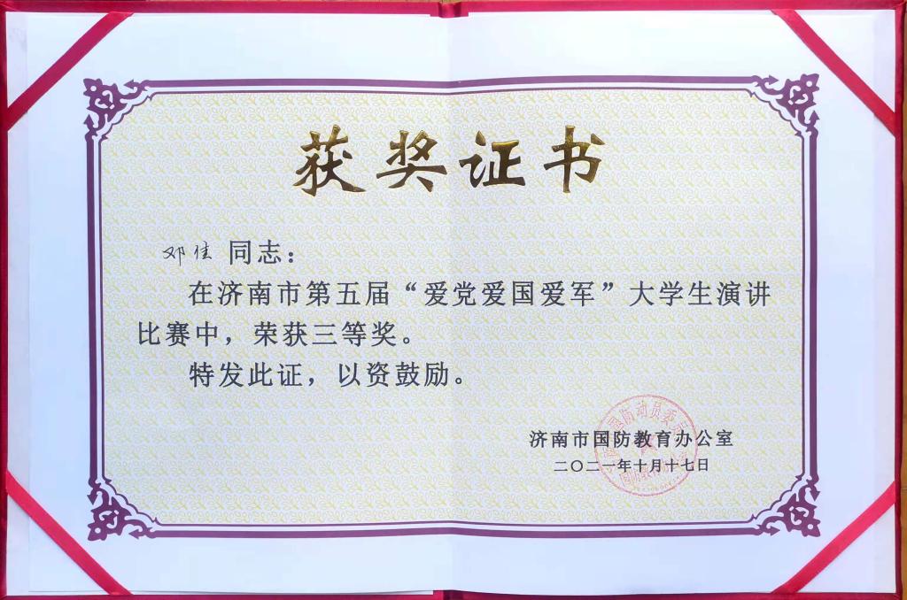 在濟(jì)南市第五屆大學(xué)生“愛黨愛國愛軍”大學(xué)生演講比賽和第五屆國防教育技能競賽賽中,在學(xué)生工作部(處)馬軍臣老師的指導(dǎo)下,我校同學(xué)喜獲佳績。