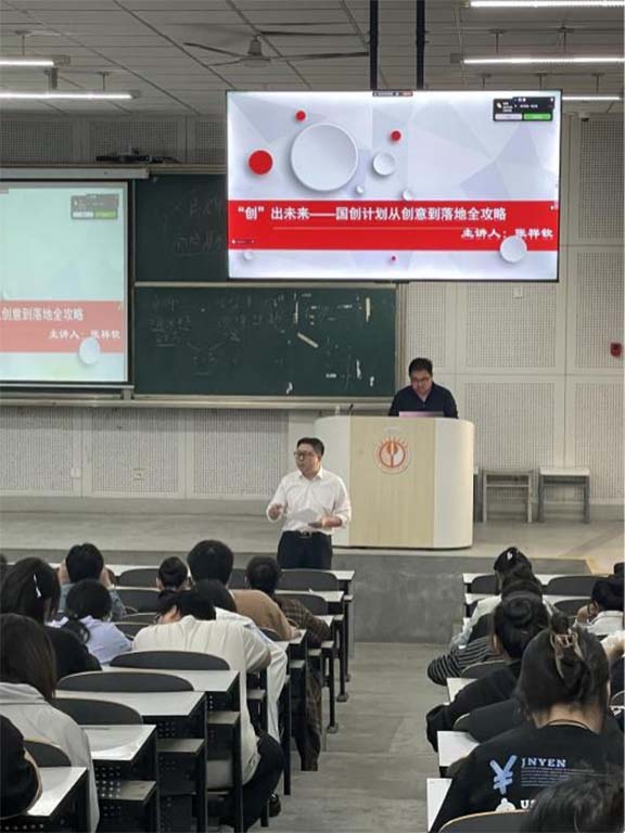張祥欽圍繞《“創”出未來—國創計劃從創意到落地全攻略》主題,結合自身豐富的理論知識與實踐經驗,講解大學生創新訓練計劃項目實施全過程。張老師特別強調選題要緊密結合社會需求與專業特色,鼓勵同學們立足實際,挖掘具有創新性與可行性的研究方向;在項目規劃環節,詳細闡述了如何制定科學合理的研究計劃,確保項目有序推進;對于項目實施過程中的關鍵問題與解決策略,張祥欽也結合典型案例進行剖析,為師生們提供了極具參考價值的實踐指導。