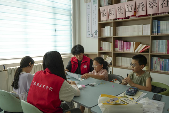 團隊來到蒙陰街道疊翠社區,為小朋友們開展“找尋民藝中的沂蒙精神——大手拉小手,紅色文化小課堂”。隊員們通過《沂蒙山小調》這一耳熟能詳的歌曲切入主題,向小朋友們講述了“黨群同心、軍民情深、水乳交融、生死與共”的沂蒙精神深刻內涵;結合自身專業,用多姿多彩的圖片讓小朋友們認識到常見的沂蒙民藝形式;把沂蒙剪紙、臨沭柳編、沂蒙手繡等傳統民藝與沂蒙精神相結合,講述民藝作為傳承沂蒙精神的藝術載體所發揮的重要作用。隊員們帶領孩子們動手體驗用黏土與繪畫表達“我心中的沂蒙情”,運用簡單易懂的方式讓沂蒙精神從“聽說”變為“觸摸”,在孩子們心中種下傳承的種子。