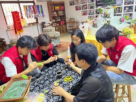 隨后,團隊來到蒙陰街道,見到了因“煎餅花”走紅的“常路大嫂”徐海霞。在她的工作室里,原本卷著咸菜的家常煎餅,被做成了牡丹、玫瑰等造型的“花束”。“俺們沂蒙人愛吃煎餅,可年輕人總覺得土?!睆垚廴A笑著說,一次偶然的機會,嘗試了三個月,她才將煎餅做成像樣子的花瓣形狀。團隊在徐老師的指導下,上手學習最基礎的玫瑰花瓣,驚嘆于普通食材的藝術蛻變,了解到其中每一個轉折、每一處細節都是通過一次次的實踐試驗出最完美的手法。她告訴團隊,煎餅在革命戰爭年代曾是八路軍的“行軍糧”,如今通過創新形態,既能讓年輕人重新愛上傳統美食,也能讓更多人通過這道“花餑餑”了解沂蒙精神。“不變的是煎餅的實在,變的是讓它走得更遠的法子?!毙炖蠋煹脑挘莱隽藗鹘y技藝在當代傳承的密碼——守正創新。