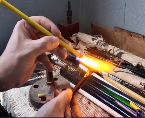 實踐團首站來到淄博市博山區,拜訪山東省工藝美術大師、山東省琉璃藝術大師李華剛先生。在工作室里,李華剛向實踐團的同學們詳細講解了琉璃的歷史、制作方法、工藝流程等知識,隨后,李華剛手持塑形鉗,在1400℃的窯爐前演示 “燈工琉璃”技法,金絲在火焰中化作流動的琥珀,轉瞬凝固成展翅的鳳凰。“從戰國時期的‘鉛鋇玻璃’到清代的 ‘博山琉璃’,我們的窯火已經燒了 2600 多年。” 李華剛大師指著他的作品《富吉家園》,向隊員們講述琉璃工藝 “持之以恒”的傳承精神。
