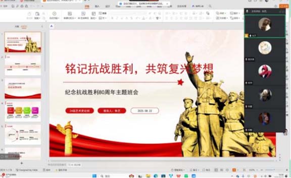 活動期間,各團支部組織開展“紀念抗戰勝利80周年”主題班會,緊密圍繞“偉大抗戰精神”展開討論。從家喻戶曉的抗戰故事到家鄉的抗戰英雄,同學們在討論中回望那段崢嶸歲月,深入了解抗戰時期的艱辛歷程與偉大成就,感受中國人民在抗戰中的堅韌不屈。同學們紛紛表示,將深刻領悟偉大抗戰精神,銘記英雄歷史事跡,用自己的力量將紅色基因接續傳承下去。