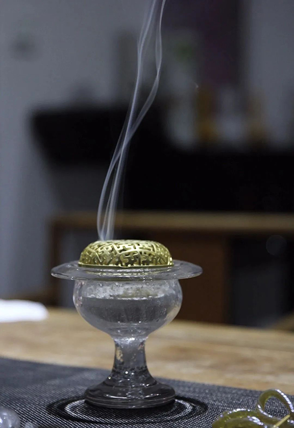 A:我們現(xiàn)在主要分兩部分進(jìn)行,一部分是自主品牌“飴山”琉璃的開發(fā),以產(chǎn)品開發(fā)為主,包含茶器物、食器、文方等;另一部分是進(jìn)行個人創(chuàng)作,以觀念性比較強(qiáng)的作品為主。從2012年成立工作室以來,選擇吹制玻璃作為主要的創(chuàng)作工藝。工藝流程大致為取料、吹制、塑形、冷加工等。我個人覺得觀念是最重要的,對于玻璃藝術(shù)專業(yè)來說,玻璃只是一種材料,這種材料是傳達(dá)觀念和品牌的一個載體。