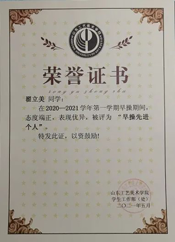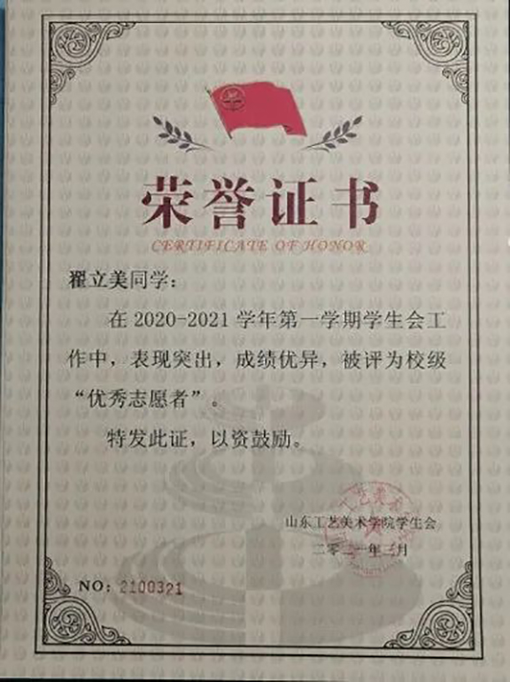 翟立美在學習期間態(tài)度端正、目標明確,于2020—2021大一學年成績優(yōu)異,以綜合第一的成績榮獲校級一等獎學金。