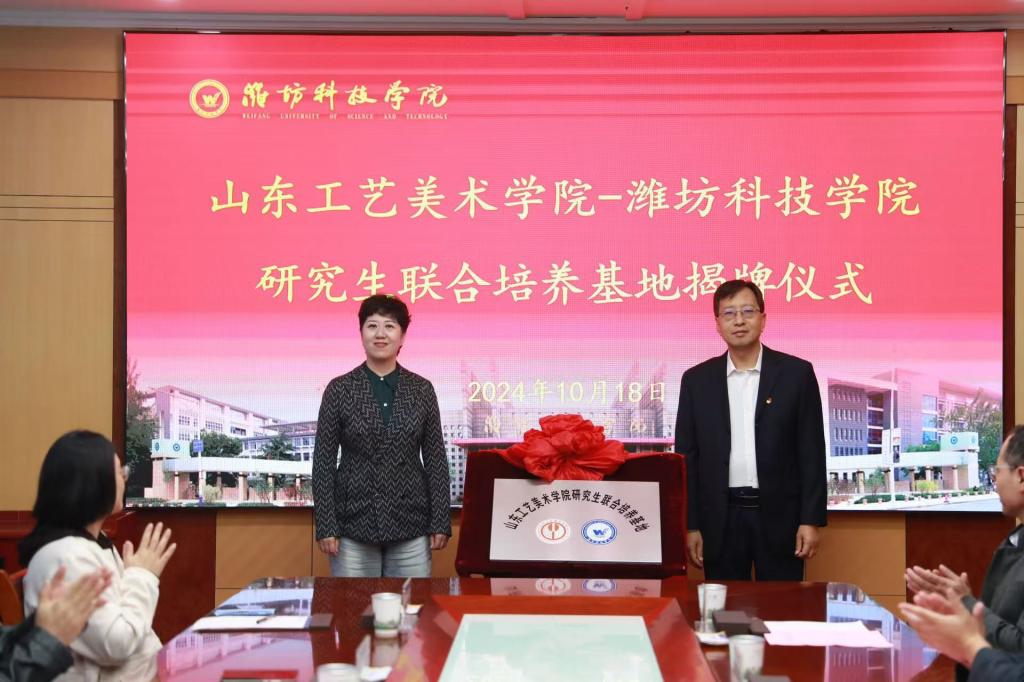 數(shù)字藝術與傳媒學院院長吳向陽與濰坊科技學院藝術學院院長姜亦金簽署研究生聯(lián)合培養(yǎng)基地協(xié)議,研究生處處長趙屹與濰坊科技學院校長、黨委副書記魏華中為研究生聯(lián)合培養(yǎng)基地揭牌。