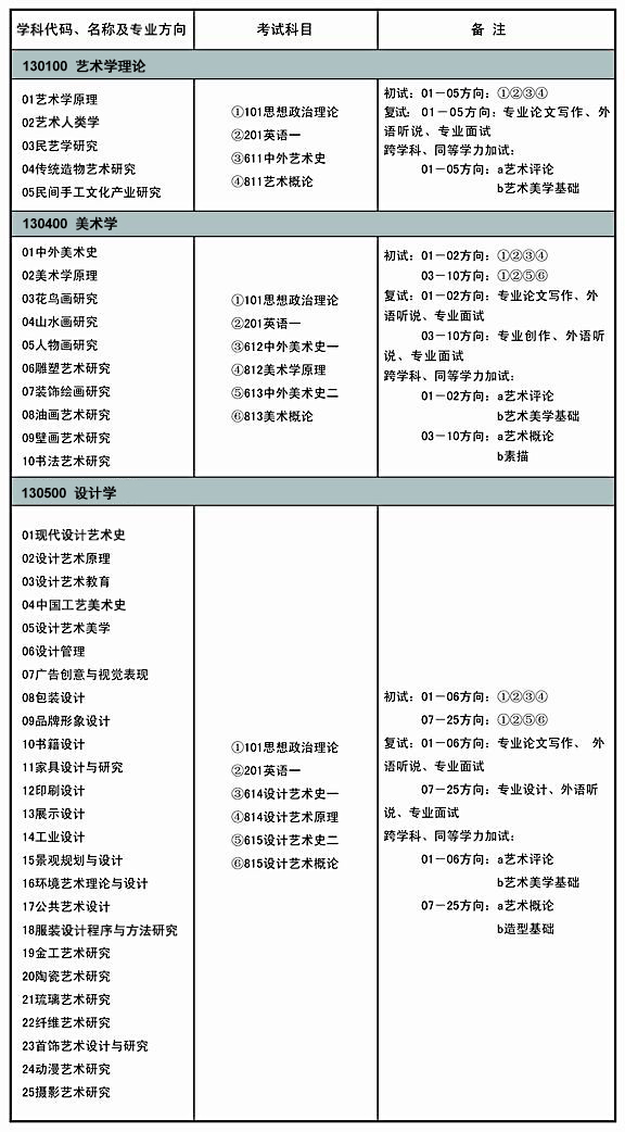 130100藝術學理論01—05方向初試參考書目: 《中國美術史教程》(增訂本),薄松年等編著,陜西人民美術出版社,2008年版。 《西方美術史教程》,李春著,陜西人民美術出版社,2008年版。 《中國美術簡史》(增訂本),中央美術學院美術史系中國美術史教研室編著,中國青年出版社,2002年版。 《外國美術簡史》(增訂本),中央美術學院人文學院美術史系外國美術史教研室編著,中國青年出版社,2007年版。 《藝術學概論》(第三版),彭吉象著,北京大學出版社,2006年版。 《現代藝術學導論》,陳池瑜著,清華大學出版社,2005年版。 130400美術學01—02方向初試參考書目: 《中國美術史教程》(增訂本),薄松年等編著,陜西人民美術出版社,2008年版。 《西方美術史教程》,李春著,陜西人民美術出版社,2008年版。 《中國美術簡史》(增訂本),中央美術學院美術史系中國美術史教研室編著,中國青年出版社,2002年版。 《外國美術簡史》(增訂本),中央美術學院人文學院美術史系外國美術史教研室編著,中國青年出版社,2007年版。 《藝術學概論》(第三版),彭吉象著,北京大學出版社,2006年版。 《美術概論》,鄧福星著,上海人民美術出版社,2009年版。03—10方向初試參考書目: 《中國美術簡史》(增訂本),中央美術學院美術史系中國美術史教研室編著,中國青年出版社,2002年版。 《外國美術簡史》(增訂本),中央美術學院人文學院美術史系外國美術史教研室編著,中國青年出版社,2007年版。 《美術概論》,鄧福星著,上海人民美術出版社,2009年版。 130500設計學01—06方向初試參考書目: 《工藝美術概論》,李硯祖著,山東教育出版社,2002年版。 《中國工藝美術史》(修訂本),田自秉著,東方出版中心,2010年版。 《現代設計藝術史》,董占軍編著,高等教育出版社,2008年版。 《外國工藝美術史》,張夫也著,山東教育出版社,2002年版。 《設計學概論》,尹定邦著,湖南科學技術出版社,2005年版。07—25方向初試參考書目: 《中國工藝美術史》(修訂本),田自秉著,東方出版中心,2010年版。 《現代設計藝術史》,董占軍編著,高等教育出版社,2008年版。 《設計學概論》,尹定邦著,湖南科學技術出版社,2005年版。