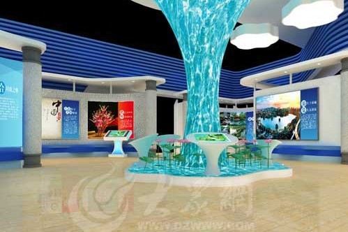 濟南展區面積為500平方米,是十七地市面積最大的展區,以“文化濟南天下泉城”為主題,設計理念圍繞“水”、“城”二字做文章,泉城最有特點的元素就是“泉”與“水”,同時她又是一座有著2600年歷史的古城,濟南歷史底蘊深厚,“天下第一泉”世人皆知,七十二名泉遍布泉城,泉水已成為濟南的靈魂,我們通過各種設計元素,用多元的展示手段來體現古老泉城的新文化概念。藍色為主色調,在視覺上表達“水”的概念。展區為四方形,其中有一面墻為整個濟南市的城市剪影,四周圍繞水的造型,這些水既是泉水,又象征著護城河,主造型體現“水環繞的城市”的設計理念。