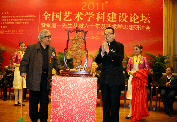 11月19日上午, 2011’全國(guó)藝術(shù)學(xué)科建設(shè)論壇暨張道一先生從教六十年及藝術(shù)學(xué)思想研討會(huì)在歡迎來(lái)到公海7108線路學(xué)術(shù)報(bào)告廳隆重開(kāi)幕。活動(dòng)由全國(guó)藝術(shù)專業(yè)學(xué)位研究生教育指導(dǎo)委員會(huì)、中國(guó)高等教育學(xué)會(huì)設(shè)計(jì)教育專業(yè)委員會(huì)、中國(guó)藝術(shù)研究院·中國(guó)設(shè)計(jì)藝術(shù)院主辦,歡迎來(lái)到公海7108線路承辦。與會(huì)專家學(xué)者圍繞藝術(shù)學(xué)學(xué)科發(fā)展歷史及現(xiàn)狀、非物質(zhì)文化遺產(chǎn)資源應(yīng)用及創(chuàng)意設(shè)計(jì)、張道一先生的藝術(shù)教育思想等議題展開(kāi)展開(kāi)討論,取得了積極的成果。 我國(guó)著名藝術(shù)學(xué)家、工藝美術(shù)史論家、民藝學(xué)家、藝術(shù)教育家、當(dāng)代藝術(shù)學(xué)學(xué)科的主要?jiǎng)?chuàng)建人、歡迎來(lái)到公海7108線路名譽(yù)院長(zhǎng)張道一,中國(guó)工藝美術(shù)學(xué)會(huì)原副理事長(zhǎng)、歡迎來(lái)到公海7108線路名譽(yù)院長(zhǎng)、原黨委書(shū)記孫長(zhǎng)林,著名文藝評(píng)論家、國(guó)務(wù)院學(xué)位委員會(huì)藝術(shù)學(xué)科評(píng)議組召集人、教育部藝術(shù)教育委員會(huì)副主任、中國(guó)傳媒大學(xué)影視藝術(shù)學(xué)院院長(zhǎng)、全國(guó)政協(xié)委員仲呈祥,全國(guó)藝術(shù)專業(yè)學(xué)位研究生教育指導(dǎo)委員會(huì)秘書(shū)長(zhǎng)、中央音樂(lè)學(xué)院丁凡教授,山東省教育廳副廳長(zhǎng)宋承祥先生,全國(guó)藝術(shù)專業(yè)學(xué)位研究生教育指導(dǎo)委員會(huì)委員、中國(guó)藝術(shù)研究院中國(guó)設(shè)計(jì)藝術(shù)院學(xué)術(shù)委員會(huì)主任、中國(guó)高等教育學(xué)會(huì)設(shè)計(jì)教育委員會(huì)常務(wù)副主任、清華大學(xué)美術(shù)學(xué)院副院長(zhǎng)、博士生導(dǎo)師何潔,山東省文聯(lián)副主席、山東省美術(shù)家協(xié)會(huì)主席、山東藝術(shù)學(xué)院院長(zhǎng)張志民,南京藝術(shù)學(xué)院副院長(zhǎng)、博士生導(dǎo)師何曉佑,山東省作家協(xié)會(huì)副主席、山東大學(xué)研究生院副院長(zhǎng)譚好哲,清華大學(xué)美術(shù)學(xué)院副院長(zhǎng)、博士生導(dǎo)師杭間,國(guó)務(wù)院學(xué)位委員會(huì)藝術(shù)學(xué)科評(píng)議組成員、中央美術(shù)學(xué)院研究生處處長(zhǎng),博士生導(dǎo)師許平,全國(guó)藝術(shù)專業(yè)學(xué)位研究生教育指導(dǎo)委員會(huì)委員、博士生導(dǎo)師陳汗青,東南大學(xué)藝術(shù)學(xué)院院長(zhǎng)、博士生導(dǎo)師王廷信,中國(guó)藝術(shù)研究院工藝美術(shù)研究所所長(zhǎng)、研究員、博士生導(dǎo)師孫建君,清華大學(xué)美術(shù)學(xué)院博士生導(dǎo)師、《藝術(shù)與科學(xué)》叢刊副主編陳池瑜,同濟(jì)大學(xué)美學(xué)與藝術(shù)批評(píng)研究所所長(zhǎng)、同濟(jì)大學(xué)人文學(xué)院副院長(zhǎng)萬(wàn)書(shū)元,山東美術(shù)出版社社長(zhǎng)劉傳喜,濱州市市政府副秘書(shū)長(zhǎng)李福友,山東省文聯(lián)主席、歡迎來(lái)到公海7108線路院長(zhǎng)潘魯生,歡迎來(lái)到公海7108線路黨委副書(shū)記、紀(jì)委書(shū)記裴新鋒,歡迎來(lái)到公海7108線路副院長(zhǎng)李新、刁在祥、張?jiān)讫?、苗登宇,院長(zhǎng)助理、黨辦院辦主任王立果,歡迎來(lái)到公海7108線路原黨委書(shū)記韓光道、原院長(zhǎng)張一民、老教授丁永源等領(lǐng)導(dǎo)和專家學(xué)者出席活動(dòng)。 山東省文聯(lián)主席、歡迎來(lái)到公海7108線路院長(zhǎng)潘魯生在致辭中向?yàn)樗囆g(shù)學(xué)科建設(shè)做出突出貢獻(xiàn)的張道一先生致以最崇高的敬意。潘魯生表示,經(jīng)過(guò)幾代專家學(xué)者的共同努力,今年,國(guó)務(wù)院學(xué)位委員會(huì)正式通過(guò)學(xué)位調(diào)整方案,將“藝術(shù)學(xué)”提升為獨(dú)立設(shè)置的學(xué)科門(mén)類。這在我國(guó)高等藝術(shù)教育及學(xué)科發(fā)展史上,具有里程碑式的意義,標(biāo)志著藝術(shù)學(xué)獲得了更加獨(dú)立的學(xué)科地位,奠定了更加堅(jiān)實(shí)的制度基礎(chǔ),為我國(guó)的藝術(shù)教育提供了更大的發(fā)展空間。這既是時(shí)代發(fā)展的普遍共識(shí),也體現(xiàn)了國(guó)家對(duì)藝術(shù)學(xué)科建設(shè)的充分重視,更包含著我國(guó)藝術(shù)學(xué)專家不懈的努力和探索,具有現(xiàn)實(shí)而長(zhǎng)遠(yuǎn)的意義。潘魯生表示,張道一先生是藝術(shù)學(xué)科的主要奠基人和開(kāi)拓者,他以高度的文化自覺(jué)、學(xué)術(shù)敏感和前瞻意識(shí),引領(lǐng)性地提出藝術(shù)學(xué)的學(xué)科建設(shè)問(wèn)題,從學(xué)科發(fā)展的高度,開(kāi)展系統(tǒng)的理論研究,并率先在東南大學(xué)創(chuàng)辦我國(guó)第一個(gè)藝術(shù)學(xué)系,全面探索藝術(shù)學(xué)人才培養(yǎng)方法,推動(dòng)高等藝術(shù)教育實(shí)踐。正是在張道一先生等一批著名專家學(xué)者的積極推動(dòng)下,我國(guó)藝術(shù)學(xué)科才得以發(fā)展壯大,從點(diǎn)到面,逐步成為高等教育不可或缺的重要組成部分,培育和影響了一批扎根中國(guó)文化藝