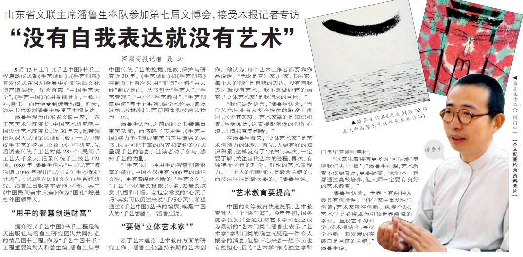 《深圳商報》A4版以“沒有自我表達就沒有藝術”發表了對我校潘魯生院長的專訪文章,并報道了《手藝中國》書系工程啟動儀式暨《手藝調研》、《手藝創意》首發儀式活動。文章認為,藝術家的藝術創造力是一種綜合的素養,首先,要有好的知識積累,這樣就有了底;其次,一定要了解、關注當代藝術的進程;再次,有獨特而堅定的理念,鮮明的藝術表現力。一個人的創新能力是最為關鍵的,而技法往往是最次要的。談到藝術教育的發展,潘魯生院長認為,中國的高等教育快速發展,藝術教育駛入一個“快車道”。今年年初,國務院學位委員會通過將藝術學科獨立成為最新的“藝術門類”。“藝術學”學科門類的確立無疑是一件令人振奮的消息,但靜下心來想一想不免也有些擔心,因為“藝術學”作為獨立學科門類畢竟剛剛啟程。“這意味著將有更多的‘可耕地’等待我們去‘開墾’。”文章強調,藝術教育不僅要普及,更要提高。“大師不一定都通過高校培養,但大師一定要有良好的藝術教育。”世界上有兩種人最具有創造性。“科學家注重發明與創造;藝術家意在創新。縱觀全球,藝術學類必將成為引領世界潮流的學科。重視藝術與科學、技術相結合,尋找學科新一輪發展的突破口是目前的關鍵。”