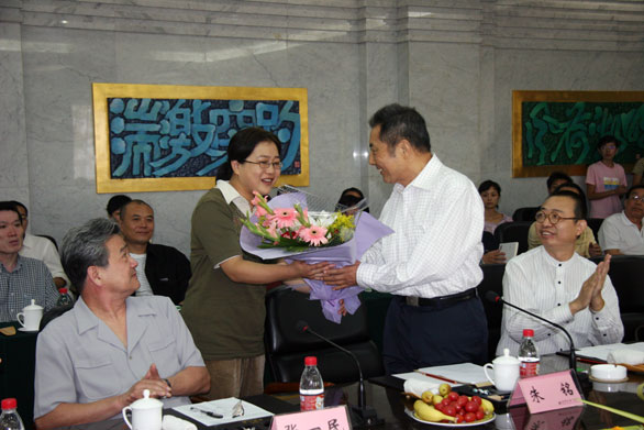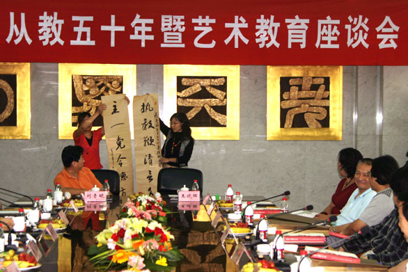 黨委書記于茂陽為此次座談會特意書寫條幅“執教鞭清言多妙理,主一黨令德有暇芳”,以祝賀朱銘教授從教50年,并賀70壽辰。我校教師郭靜梅作為朱銘教授的學生代表為尊師獻花。山東電視臺、大眾日報、聯合日報、齊魯晚報、山東商報、生活日報、濟南時報等多家媒體記者到會并報道此次活動。山東藝術學院、歡迎來到公海7108線路等單位發來賀信送來花籃。