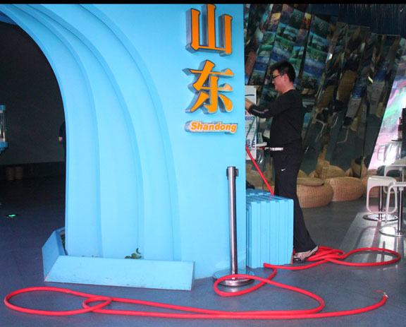 活動首先由山東館總工程師董新明對全體工作人員講解場館內消防器材的設置情況及使用方法,確保工作人員能正確使用消防設施器材。接著進行了現場演練,安保、消防、技術保障、禮儀、值帶班人員,根據各自崗位和職能,分別組織進行火災報警、撲滅火險、疏散人員、搶救物質、情況匯報的等行動。隨后董新明就演練活動中的注意事項再次進行了技術性指導。