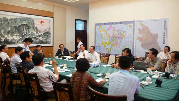 ,院長助理苗登宇,省世博會創作團隊展示設計組組長郭去塵,副組長韓文濤,科研處副處長文案組孫磊,設計組王延羽、李海濤一起聽取了項目方案匯報。
