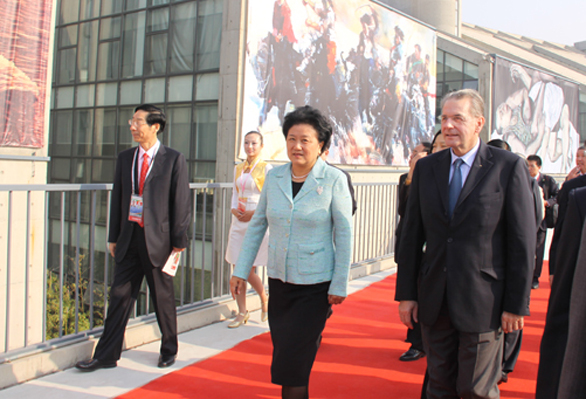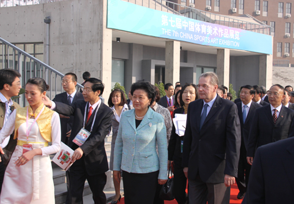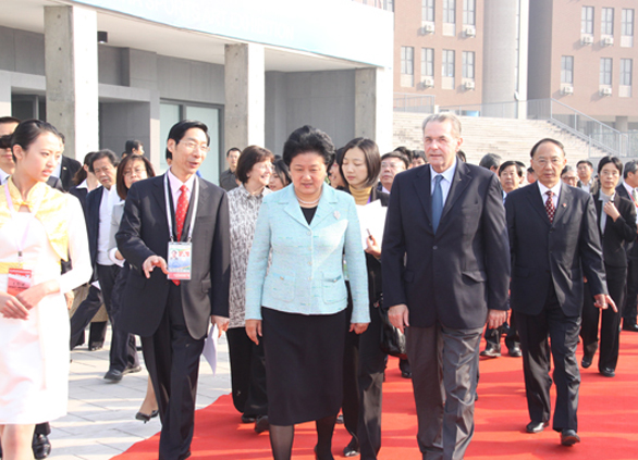 在第十一屆全國運動會即將開幕之際,10月16日上午,中共中央政治局委員、國務委員劉延東在我校長清校區會見了國際奧委會主席雅克?羅格一行,一起參加第七屆中國體育美術作品展覽開幕式并參觀展覽。 國家體育總局局長劉鵬,教育部部長周濟,國務院政策研究室副主任江小娟,國家體育總局副局長于再清、馮建中,中國文聯副主席、中國美協主席劉大為,國際奧委會委員、中國香港奧委會主席霍震霆,山東省省委副書記、省長姜大明,山東省省委常委、宣傳部長李群,山東省副省長黃勝、李兆前等中央國家機關和山東省領導陪同。
