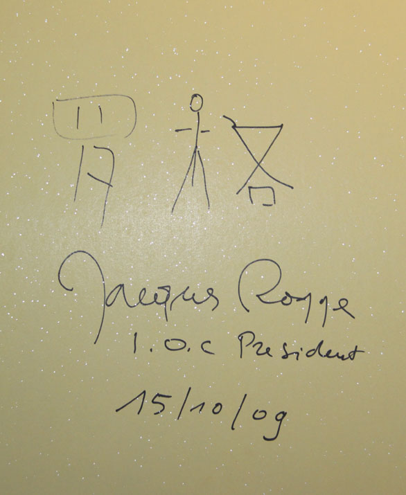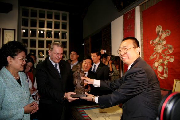 潘魯生院長向國際奧委會主席雅克·羅格贈送孔子雕像與第七屆中國體育美術展覽作品畫冊