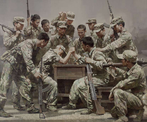 有一幅名字叫《較量》,表現的是軍人在扳手腕,感覺很有氣勢,以前在我心目中軍人都是很嚴肅的,但是這幅作品卻表現了他們很生活的一個場景,感覺和原來不一樣。