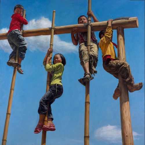 印象最深刻的是有一幅很大的,名字是《青銅時代把酒論英雄》,里面有很多的名人,很有意思;還有一幅《攀》,四個小朋友互相玩逗,表情都非常生動,我覺得讓人看了之后有一種感染力,想讓人駐足多看一段時間;再就是因為我本身的專業是品牌設計,屬于平面設計,就特意看了一些版畫的作品,感覺也是非常精美,能看出作者在創作過程中融進了很多努力。