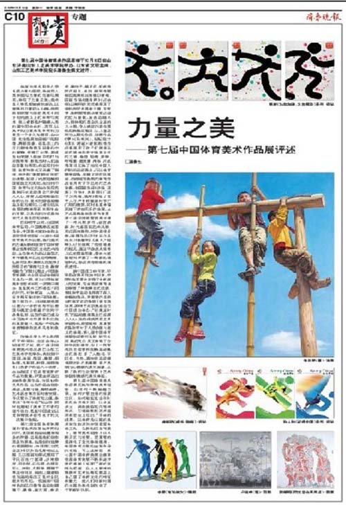 自1985年以來,由國家體育總局、中國奧林匹克委員會、中國美術(shù)家協(xié)會和全運會組委會共同主辦的中國體育美術(shù)作品展,是用美術(shù)的力量反映和宣揚中國體育事業(yè)發(fā)展?fàn)顩r的文化藝術(shù)活動。這些美術(shù)作品以造型藝術(shù)傳播奧林匹克運動精神,弘揚和發(fā)展《奧林匹克憲章》所倡導(dǎo)的“體育與文化、教育相融合”的現(xiàn)代理念。中國體育美展配合全國運動會每四年舉辦一屆,成為中國體育美術(shù)創(chuàng)作水平的一次集中展示,也是美術(shù)工作者在不同的時代,對體育這一人類永恒主題所做出的不同詮釋。到目前為止,中國體育美展已有六十余件優(yōu)秀作品被國際奧委會收藏并陳列于洛桑總部,這些作品已成為中國美術(shù)對外展示和交流的重要窗口,也是中華民族體育精神和藝術(shù)風(fēng)格的象征。